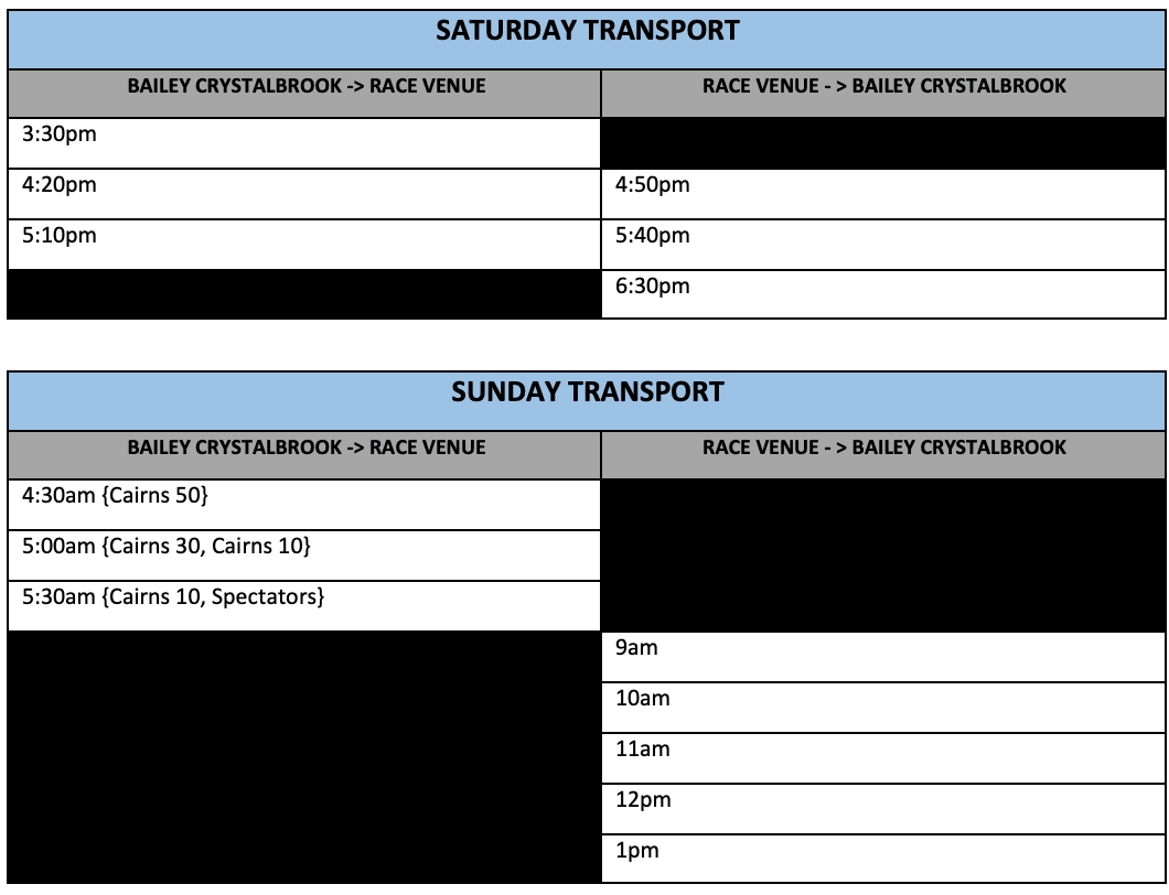A shuttle bus will also run between Cairns City (Crystalbrook Bailey) and Glenoma Park over the weekend. Bus schedule is below. Limited spaces available, therefore, all bus tickets need to be pre-booked at the link below.